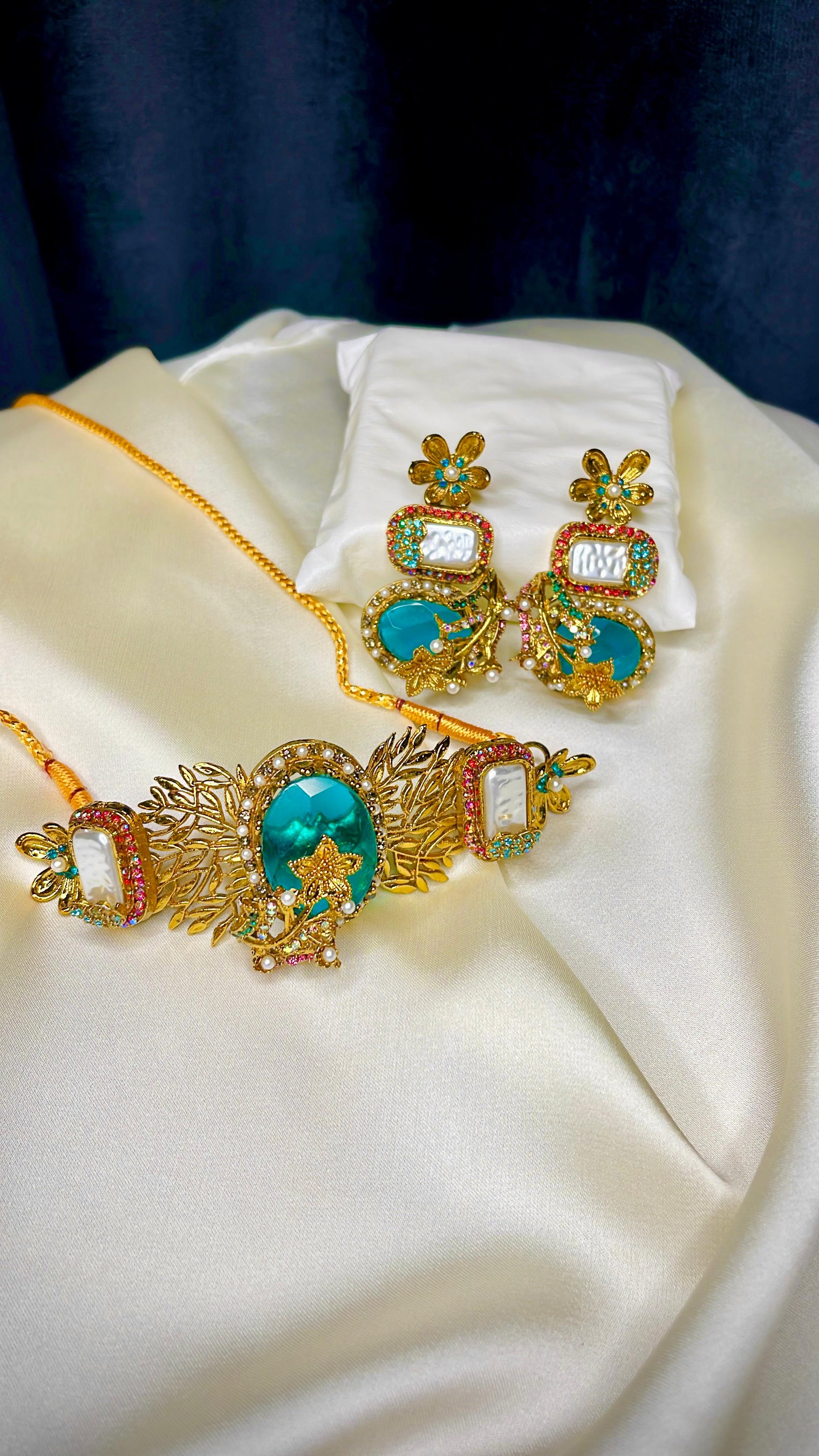 Turn heads on your special day with the Gehna Spring Bloom Bridal Set, a breathtaking fusion of turquoise elegance, lustrous pearls, and golden artistry. The statement choker and matching earrings are adorned with intricate floral details, shimmering stones, and delicate leaves — capturing the essence of luxury and grace. Perfect for brides who wish to shine with poise, tradition, and a touch of ocean-inspired beauty.